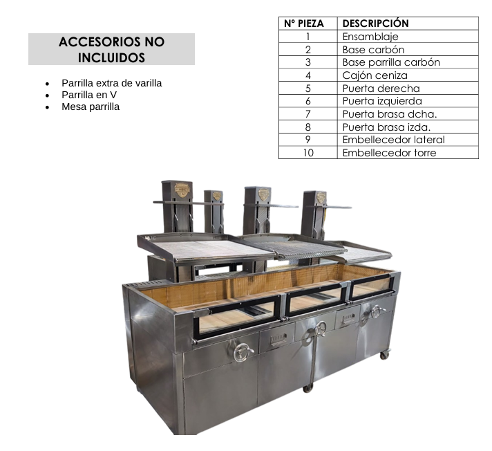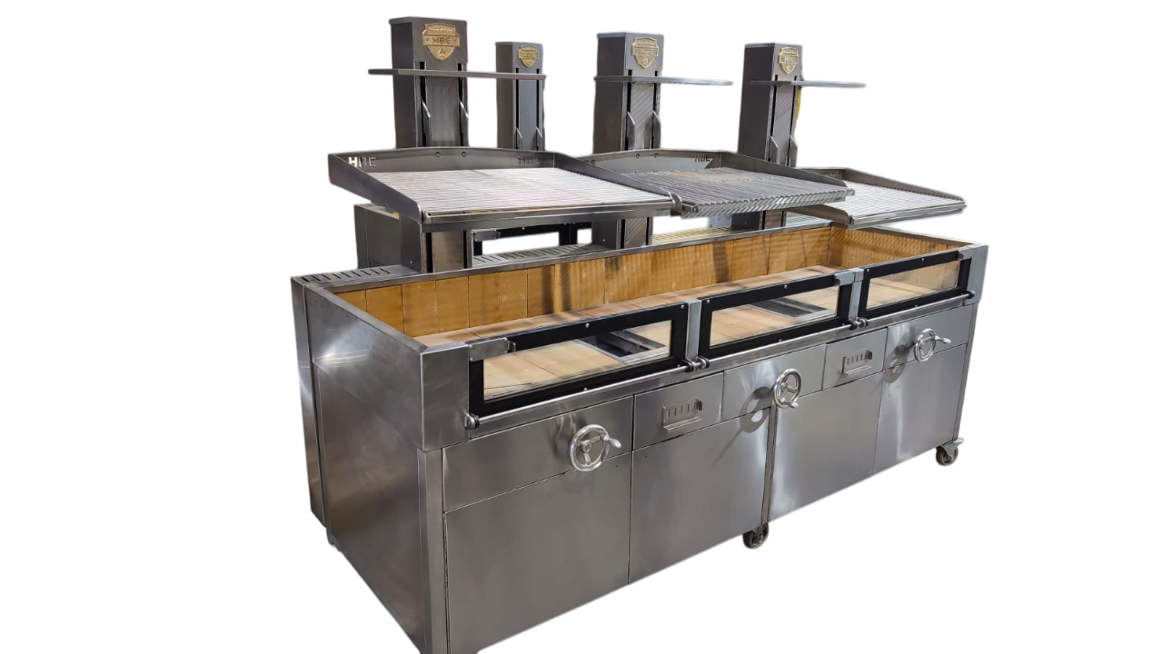Una parrilla abierta que, gracias a su cómodo sistema de elevación y freno posicional, permite regular la altura entre los alimentos y las brasas con seguridad y un mínimo mantenimiento.